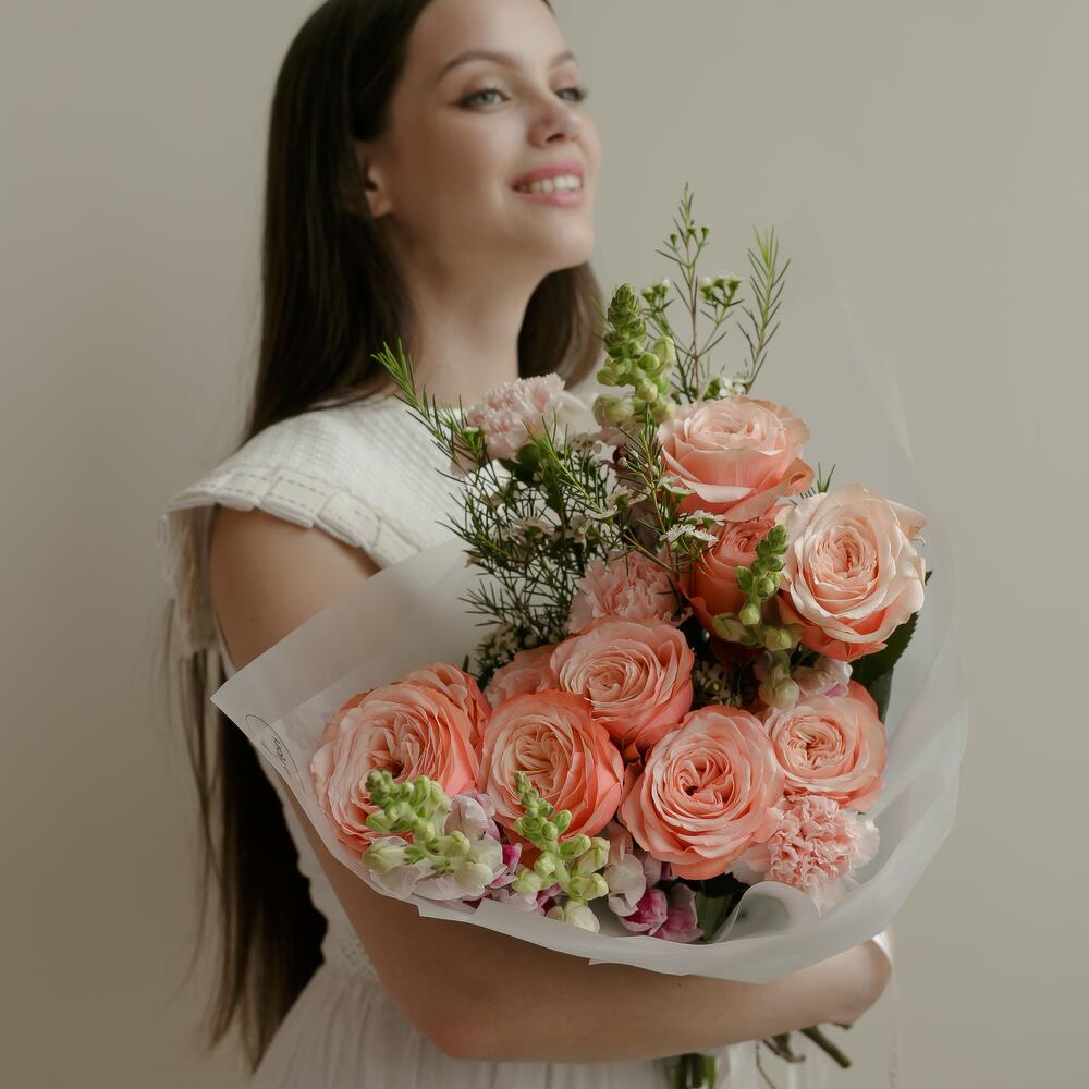 Роза Эквадор – 9 шт.Гвоздика – 4 шт.Фисташка – 3 шт.Хамелациум – 1 шт.Упаковка дизайнерская – 1 шт.антиринум – 4 шт.любовь флориста – 1 шт.подкормка для цветов – 1 шт.инструкция по уходу за цветочками – 1 шт.