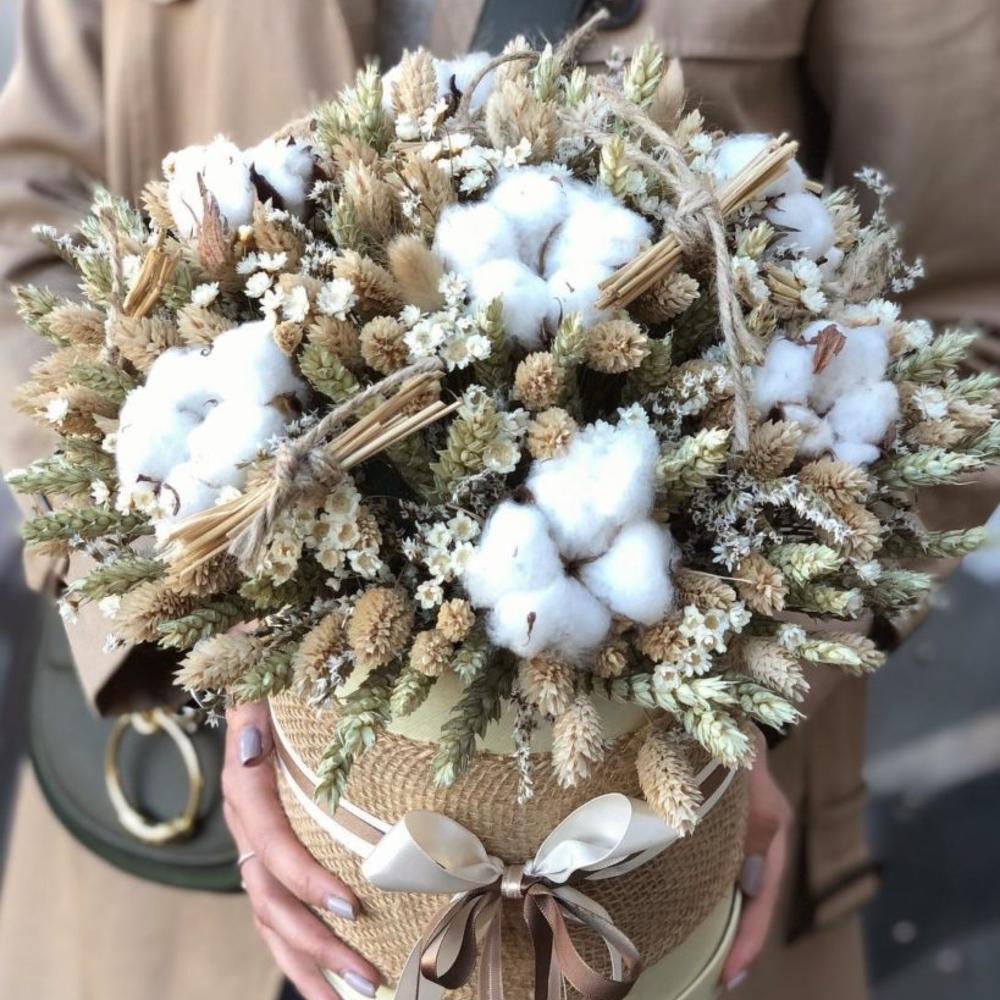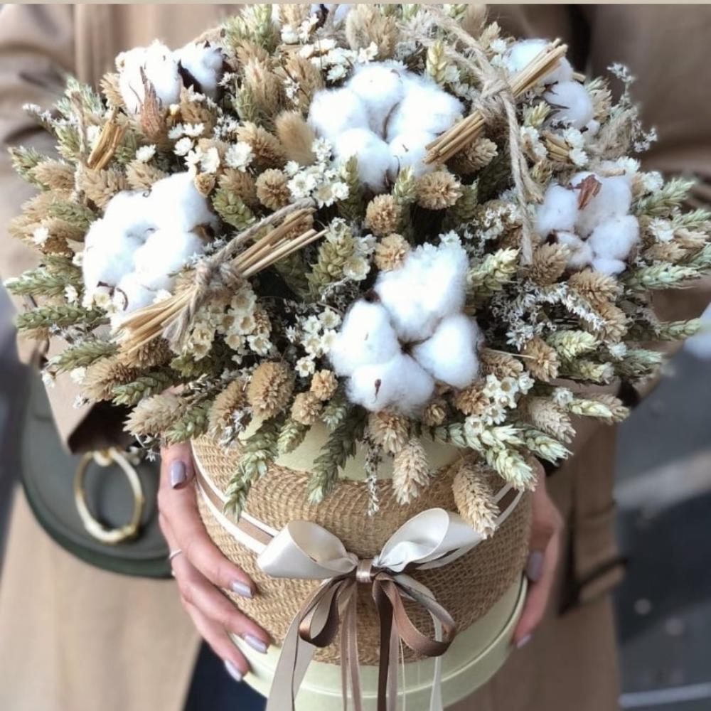 Лимониум – 15 шт.Статица – 9 шт.Хлопок – 6 шт.Коробка шляпная – 1 шт.Декор – 4 шт.Лагурус – 77 шт.Оазис флористический – 1 шт.Пшеница (сухоцвет) – 33 шт.лента декоративная – 3 шт.