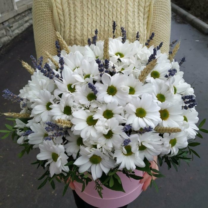 Ромашки с лаванда в шляпной коробке