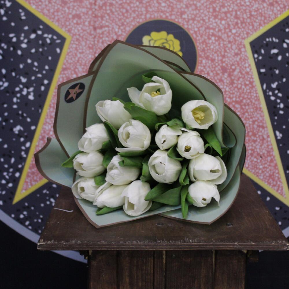 Лента атласная – 1 шт.Тюльпан белый (голландия) – 15 шт.Пленка дизайнерская – 2 шт.