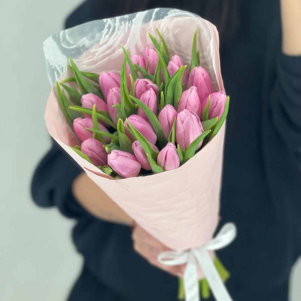 Упаковка – 2 шт.Лента атласная – 1 шт.сиреневый тюльпан – 19 шт.