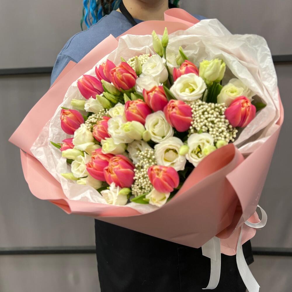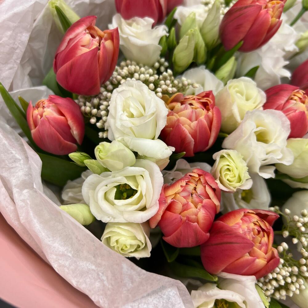 Тюльпан пионовидный – 15 шт.эустома белая – 4 шт.Озотамнус – 4 шт.Тишью – 2 шт.Пленка матовая – 5 шт.Лента атласная – 2 шт.