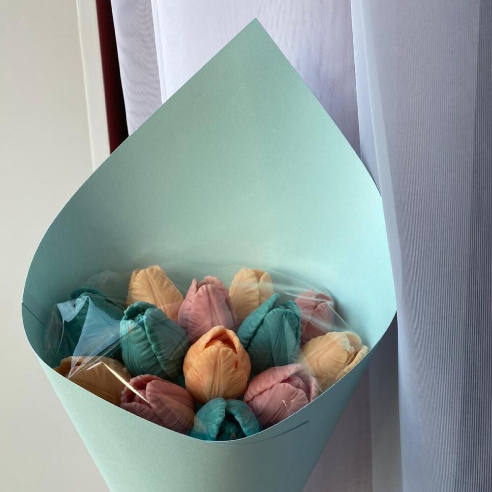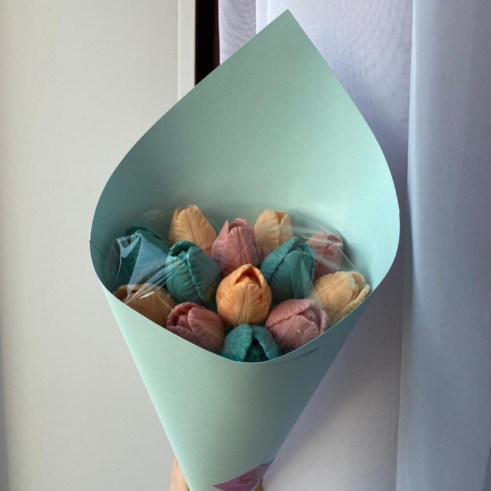 шоколадные тюльпаны – 13 шт.деревянные шпажки – 13 шт.прозрачная защитная пленка – 1 шт.упаковочная бумага – 1 шт.