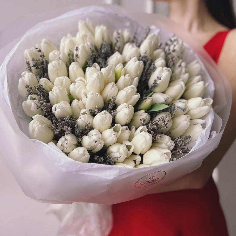 белые тюльпаны – 71 шт.Лаванда – 15 шт.Упаковка дизайнерская – 1 шт.