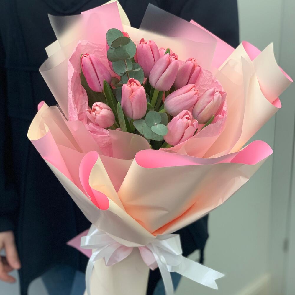 Тюльпан – 11 шт.Эвкалипт – 1 шт.Дизайнерская упаковка – 2 шт.Атласная лента – 1 шт.