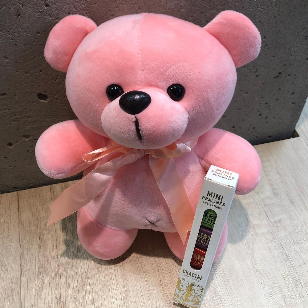 Тюльпан – 11 шт.Упаковка дизайнерская – 1 шт.Мишка плюшевый – 1 шт.конфеты счастье – 1 шт.Пакет подарочный – 1 шт.